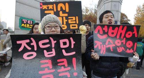 11月18日,韓國2011年度高考在82個(gè)考區(qū)的1206個(gè)考場(chǎng)同時(shí)舉行。 圖為考生飛奔進(jìn)入考場(chǎng)。