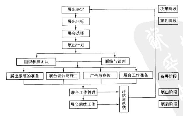 服裝企業(yè)參展的整個(gè)過程可分為五個(gè)階段,即決策階段、策劃階段、備展階段、展出及展后階段,見下圖,