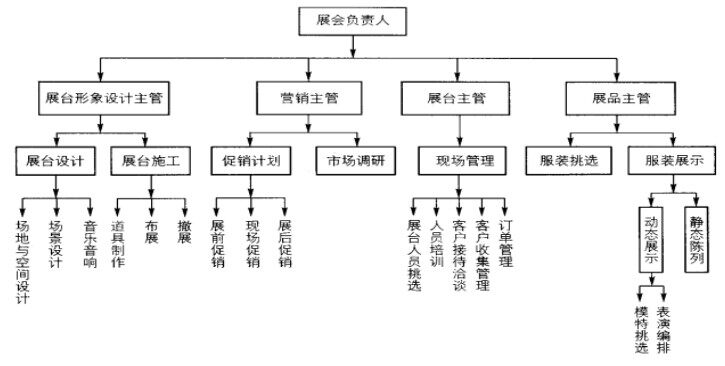 服裝企業(yè)一旦決定了參加或舉辦一場時裝展會,就要先指派展會項目總負(fù)責(zé)人,由他總管展會的各項工作。根據(jù)展會的工作需要,再進行職責(zé)分工和人員配置。通常會從相關(guān)部門抽調(diào)以下人員進行主要工作的分管:負(fù)責(zé)展臺形象設(shè)計的主管人員;負(fù)責(zé)展會促銷及調(diào)研的營銷主管;負(fù)責(zé)展會現(xiàn)場管理的展臺主管;負(fù)責(zé)展會服裝的展品主管。各主管人員再根據(jù)工作需要選配工作人員,見下圖。